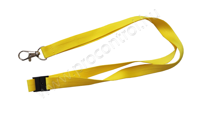 Nyakszalag, nyakpánt 15mm, sárga poliészter passztartó + cseppkarabíner + biztonsági csat